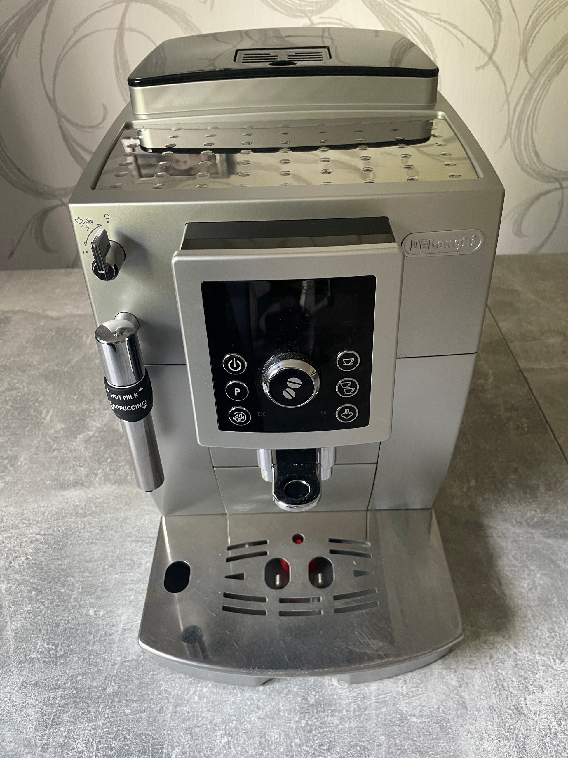 Zum Verkauf steht ein Kaffeevollautomat der Marke DeLonghi. Es ist eine ECAM 23.420 SB. Der Kaffeevollautomat wurde komplett gereinigt und entkalkt. Er funktioniert und ist technisch in einem einwandfreien Zustand. Es sind minimale Gebrauchsspuren am Gehäuse und Abtropfschale vorhanden.