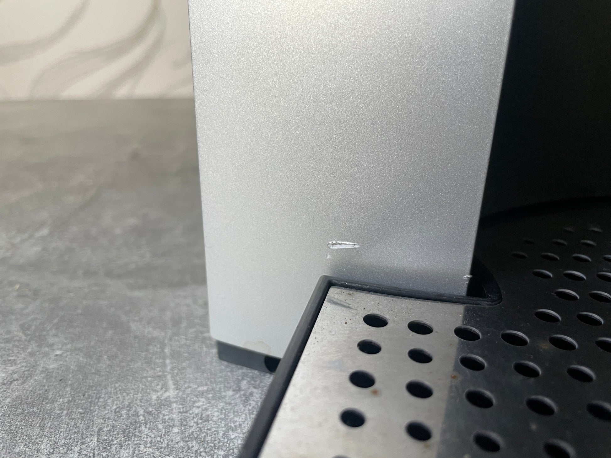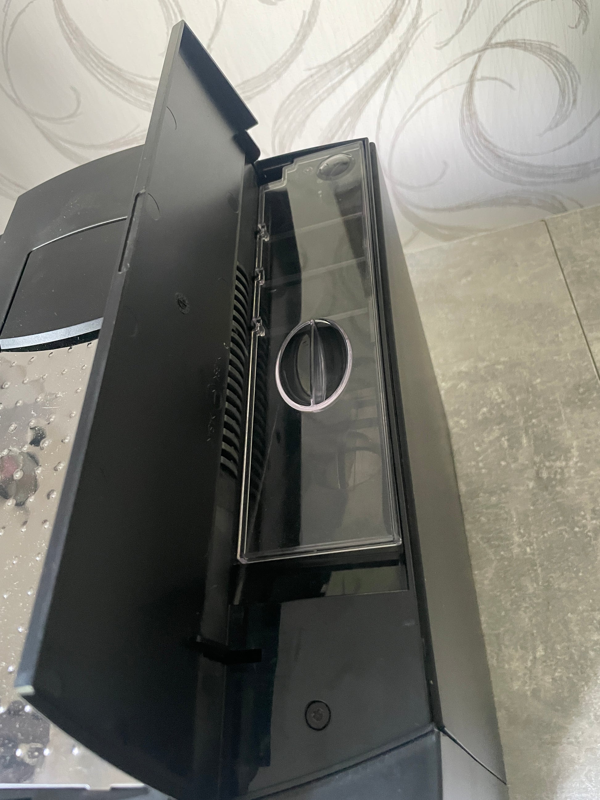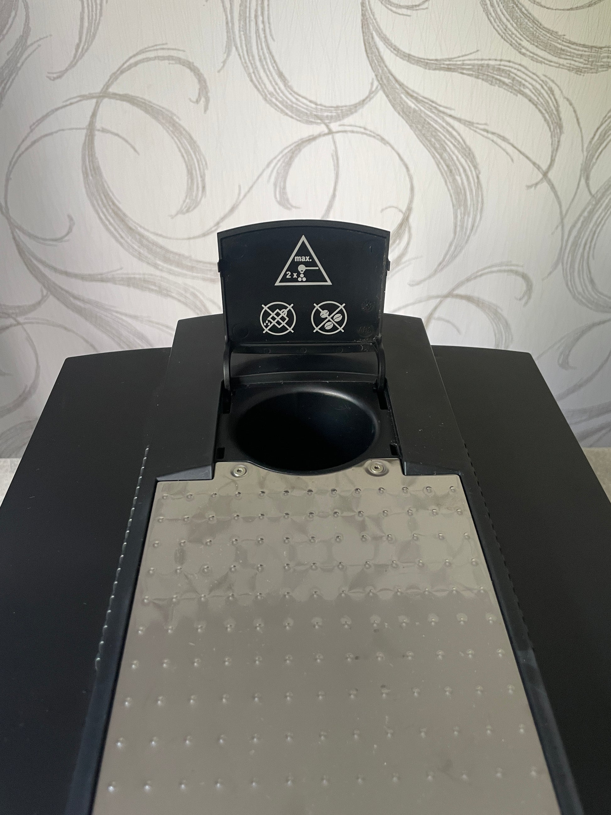 Der Kaffeevollautomat befindet sich in einem technisch einwandfreien Zustand. Die Maschine wurde komplett von innen und außen gereinigt. Die Brühgruppe wurde revidiert und alle Dichtungen erneuert. Eine Ecke von der Tresterschale ist Defekt.
